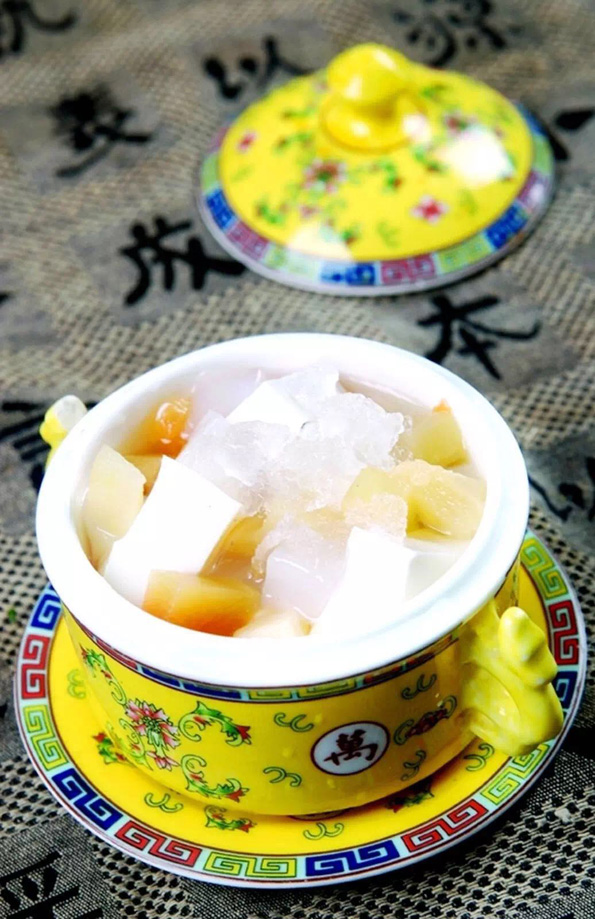 白白的豆腐上面點(diǎn)綴著兩只紅綠櫻桃,很有賣相,五塊錢一份。