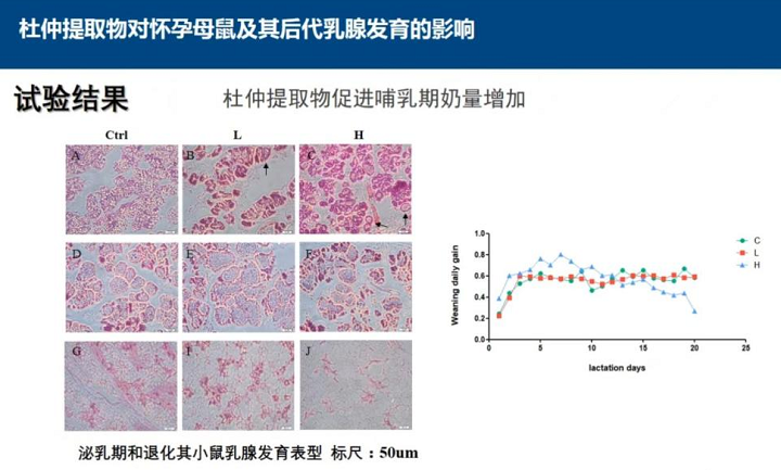 杜仲提取物對(duì)懷孕母鼠及后代乳腺發(fā)育的實(shí)驗(yàn)可以得出杜仲提取物可以促進(jìn)懷孕期乳腺增殖、促進(jìn)哺乳期奶量增加、促進(jìn)青春期乳腺導(dǎo)管增殖和末端芽結(jié)構(gòu)(TEB)的形成。